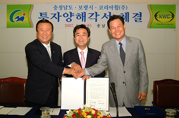 도와 보령시는 코리아휠(주)유치를 위해 기업유치 T/F팀을 구성, 3년동안 수십차례 출장을 통한 꾸준한 설득과 8월 27일 대우통신 본사에서 김태흠 정무부지사와 보령시장 토지소유주인 대우통신 대표간의 전격 토지매각 합의로 결실을 맺게 된 것이다.
