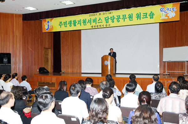 대전시 중구(구청장 李殷權)가 구민이 만족할 때까지 복지서비스 제공하기 위해 주민생활지원서비스 전달체계 혁신 추진을 담당하고 있는 구․동 공무원 192명을 대상으로 지난달 31일과 장수마을에서 주민복지전달체계 변화에 따른 전담공무원의 역할과 자세를 주제로 워크숍을 가졌다.