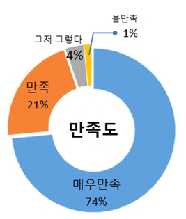‘의회교실 프로그램의 전체적인 만족도’ 질문에서 응답자 중 74%(258명)가 ‘매우만족’, 21%(75명)가 ‘만족’한다고 답해 95%의 학생이 만족하는 것으로 조사됐다.