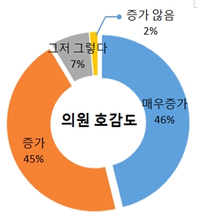 또한 ‘의회교실 참가 후 시의회 및 시의원에 대한 호감도 증가’ 질문에서 46%(162명)가 ‘매우증가’ 45%(159명)가 ‘증가’ 했다고 답해 의회교실 운영이 호감도 상승의 중요한 역할을 한 것으로 보인다.