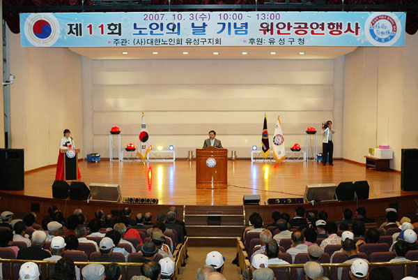 (사)대한노인회 유성구지회는 3일 한국과학기술원 대강당에서 진동규 유성구청장과 임재인 구의회의장 등 지역인사를 비롯한 1,000여명의 어르신들이 참석한 가운데 제11회 노인의 날 기념행사를 열어 노인복지 유공자에 대한 표창과 노래자랑 등 다채로운 기념공연을 실시했다