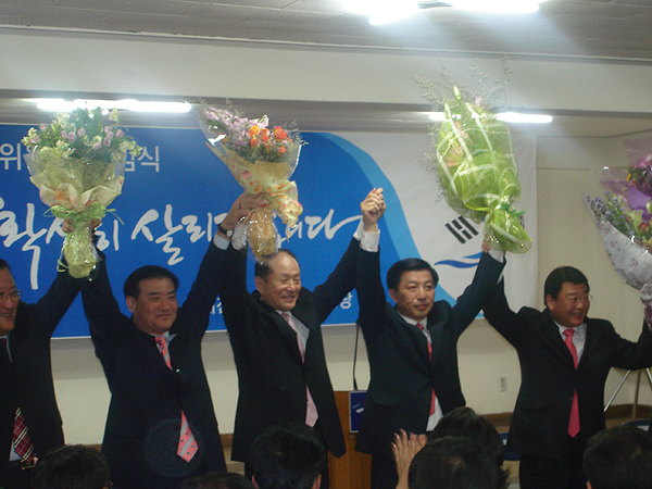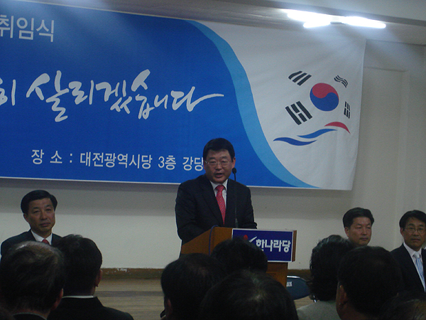 5일 이재선 한나라당 대전시당 위원장 취임식장은 그동안 얼굴 못보던 시구의원들도 보여 대전시당이 화합과 단결로 하나가 되었다고 선언하는 행사였다.