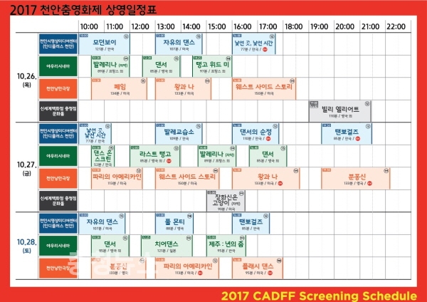 이번 ‘2017 천안춤영화제’는 신세계백화점충청점 문화홀, 야우리시네마, 천안시영상미디어센터, 천안낭만극장 등 총 네 곳에서 진행되며, 1940년대 고전영화부터 춤을 테마로 한 현대 다큐멘터리까지 다양한 영화들이 3일 동안 활발히 상영된다.