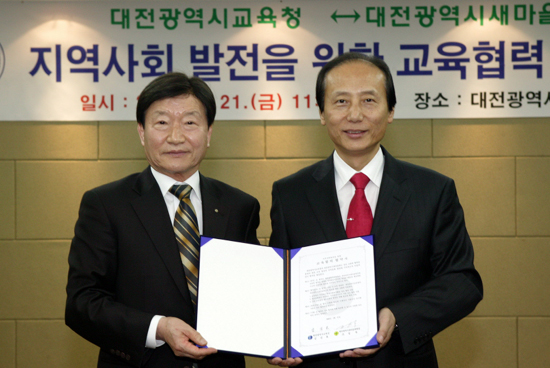 대전시교육청(교육감 김신호)과 대전시새마을회(회장 조성욱)는 21일(금) 오전 11시 중회의실에서 상호 교류와 협력을 통하여 대전 교육 발전과 지역 문화 창달에 기여하고자 지역사회환경가꾸기 사업과 학생봉사활동 지도를 내용으로 하는 교육협력 협약을 체결했다.