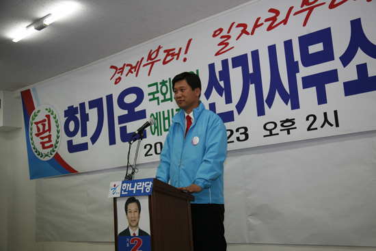저 한기온, 집권여당의 힘 있는 일꾼이다. 이명박 대통령의 상임특보였 기 때문에 대통령을 언제든지 만날 수 있는 유일한 후보다. 여러분께서 저 한기온을 국회로 보내만 주신다면 지역경제를 살리는 것은 물론이요, 도시철도, 재개발, 교육, 복지, 문화에 이르기까지 확실하게 바꿀 수 있다.”고 말했다.